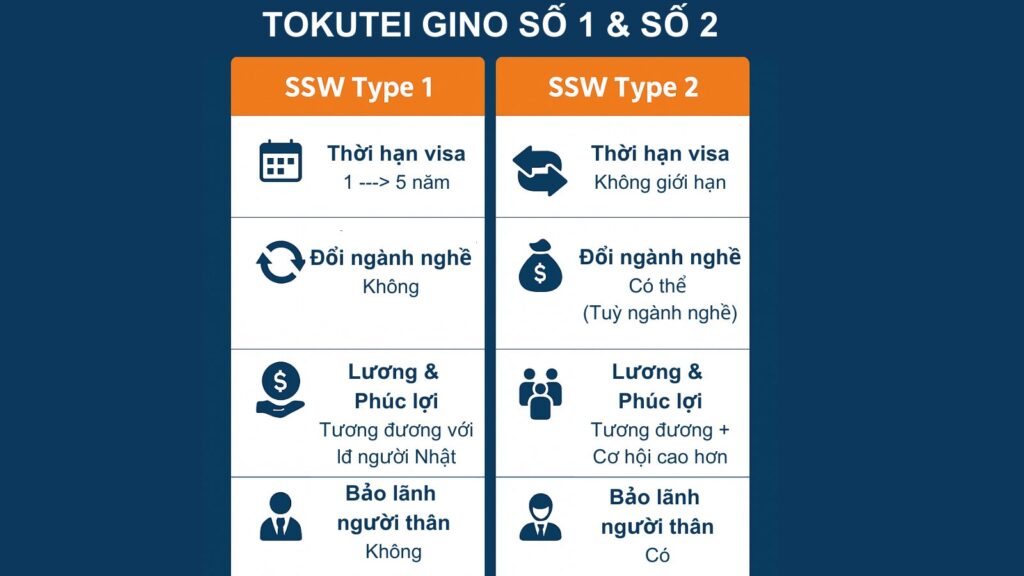 - Thời hạn & lộ trình làm việc dài hạn: Visa Tokutei Gino loại 1 cho phép lưu trú tối đa 5 năm; nếu đủ điều kiện lên Tokutei Gino loại 2, có thể gia hạn liên tục, không giới hạn số năm.
