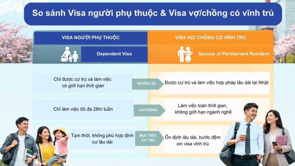 Lưu ý: Người lao động không nên nhầm lẫn visa phụ thuộc (Dependent visa) với visa vợ/chồng theo diện kết hôn. Visa phụ thuộc chỉ áp dụng cho người đi theo lao động hoặc du học sinh, và thường bị giới hạn thời gian làm thêm, không phù hợp với mục tiêu định cư lâu dài tại Nhật Bản.